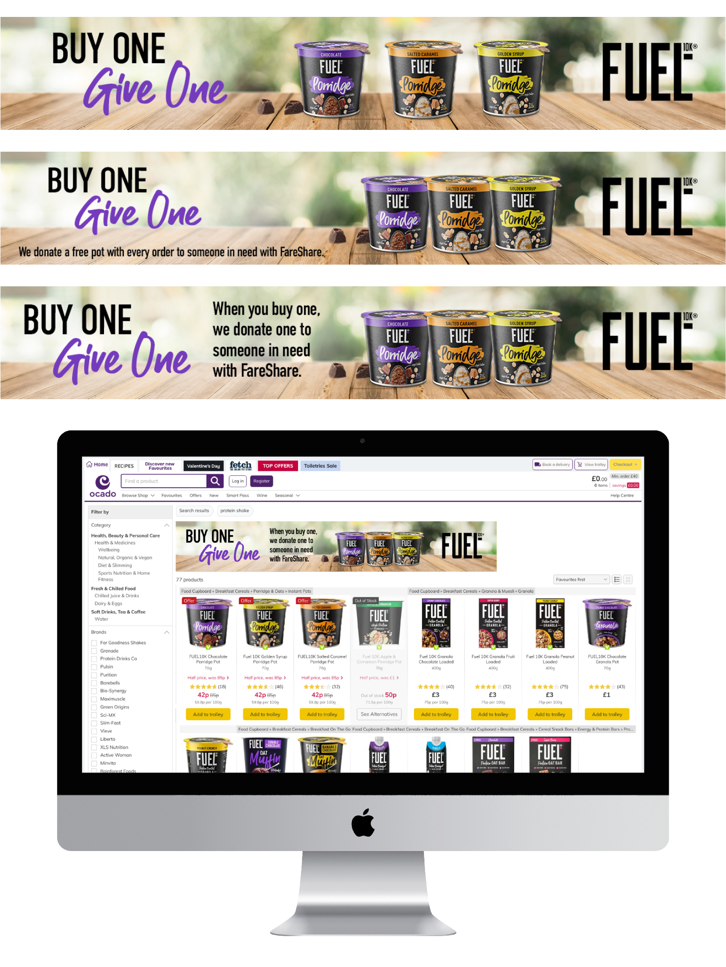 For the whole month of February, Fuel has partnered with FareShare, a food redistribution charity. For every pot they sell, they will also donate a portion of porridge to someone in need. To encourage sales across suppliers, I implemented this campaign to encourage sales and awareness to users shopping with Ocado. Three designs were proposed for use.